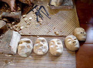 A Balinese mask starts as a tree. The steps to making a mask: sawing the wood, axeing the block, chisel work to rough in the features, modeling with curved and straight knives, sanding, painting.